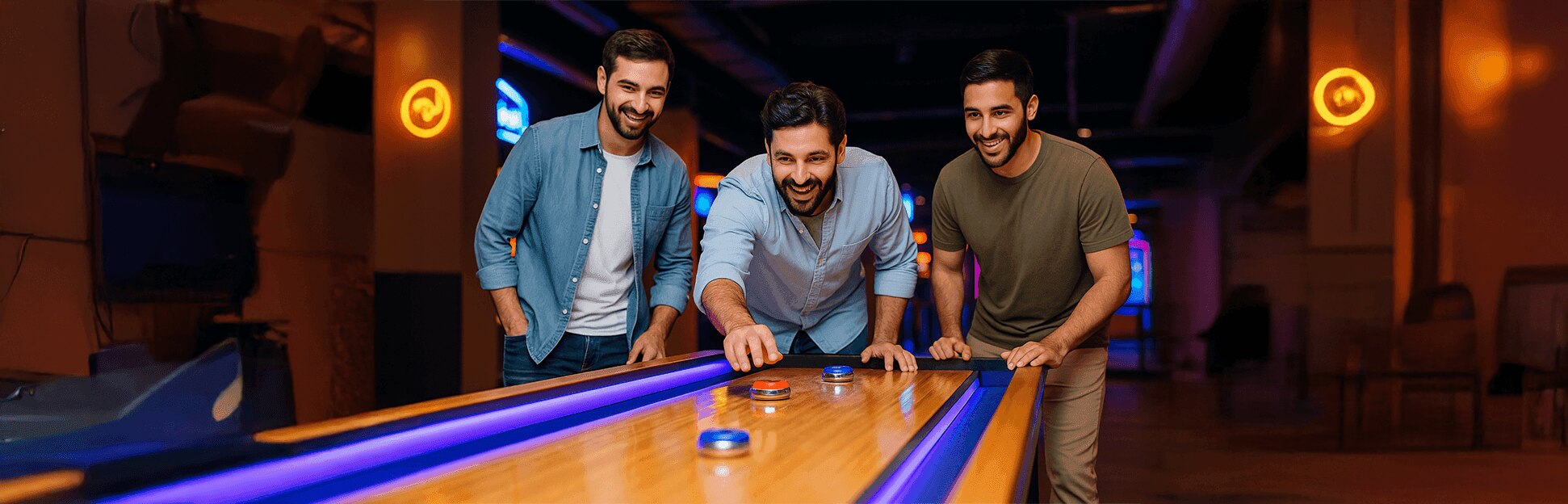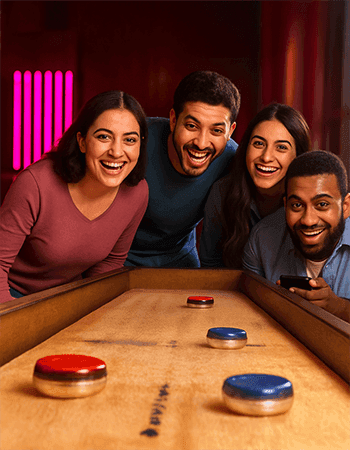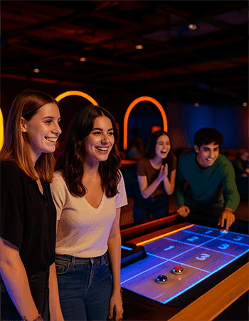 Smooth slides, sharp aim and laid-back fun. Get ready to slide, score, and show off your skills with Shuffle Board, the classic game with a high-tech twist! Grab your friends, pick your pucks and battle it out on sleek digital lanes that light up every move. 50% skill, 50% strategy. Slide and outplay your crew in style. Slide, sip and score with Shuffle Board, the classic game turned into a high-energy showdown! Grab your crew, send those pucks flying and watch the digital lanes light up with every slick shot.